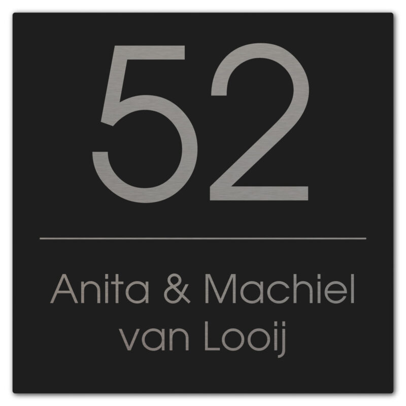 Om een zwart naambord te maken gebruiken we een aluminium rvs-look naamplaat als basis. We voorzien de plaat van een matzwarte toplaag. De delen in het ontwerp die grijs zijn worden niet bedrukt en krijgen hierdoor een zilveren rvs-look kleur. Dit zorgt voor een luxe en uitstraling. Een zwart naambord past ook heel goed in een industriële omgeving.